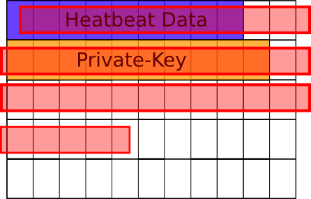 Schematische Darstellung des Speicherbereichs in Blöcken von OpenSSL, mit Private-Key, Heartbeat Daten und falsch angegebener Länge der Daten (rot markiert)[/caption]