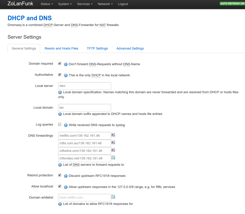 You don’t want all the DNS request to go through the uFlix DNS. To make that happen, use the DNSForwarding settings to only forward the necessary Domains to uFlix.On your openWrt webinterface go to ”Network -> DHCP and DNS”, there you will find the section _DNS forwards. _There you need to add some Netflix domains to be resolved via the uFlix server. Currently (13.05.2016) the Domains are:
