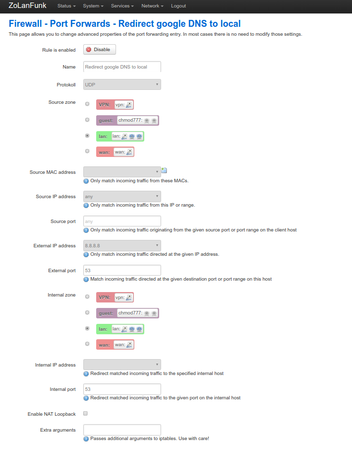 Additionally to that (thanks @DB9MAT for reminding me to mention that) the android app and chromecast use the hardcoded googledns server, so you can’t just switchout the used dns server for those devices. In order to still get them to use the uFlix DNS you have to setup some iptables rules which redirect all dns traffic which goes to 8.8.8.8 and 8.8.4.4 to the right dns server (in this case localhost /the router). For that go to “Network->Firewall->Port Forwards” and add a rule which forwards all traffic that is going to 8.8.8.8 on port UDP:53 to localhost port UDP:53. Do the same thing for 8.8.4.4.